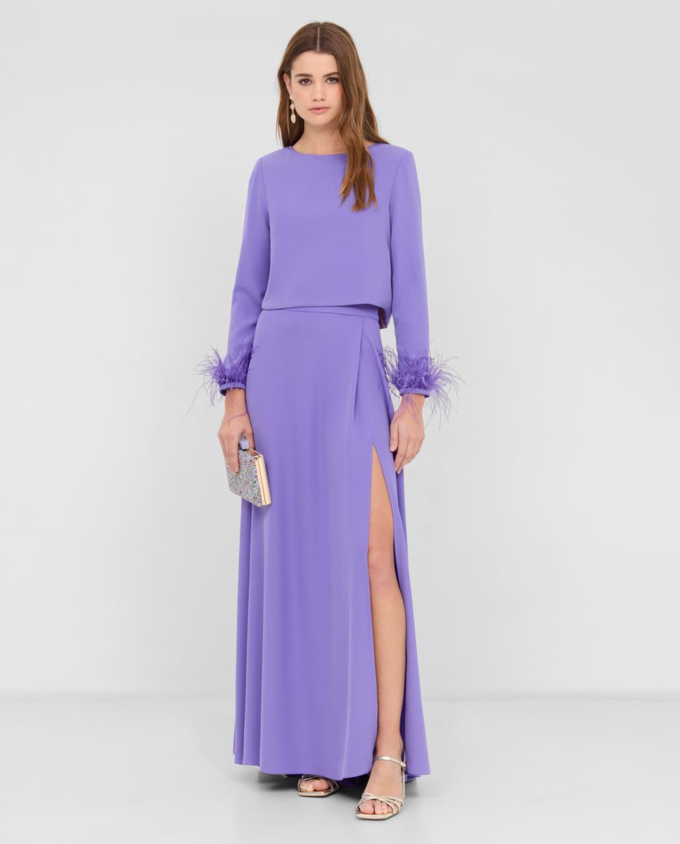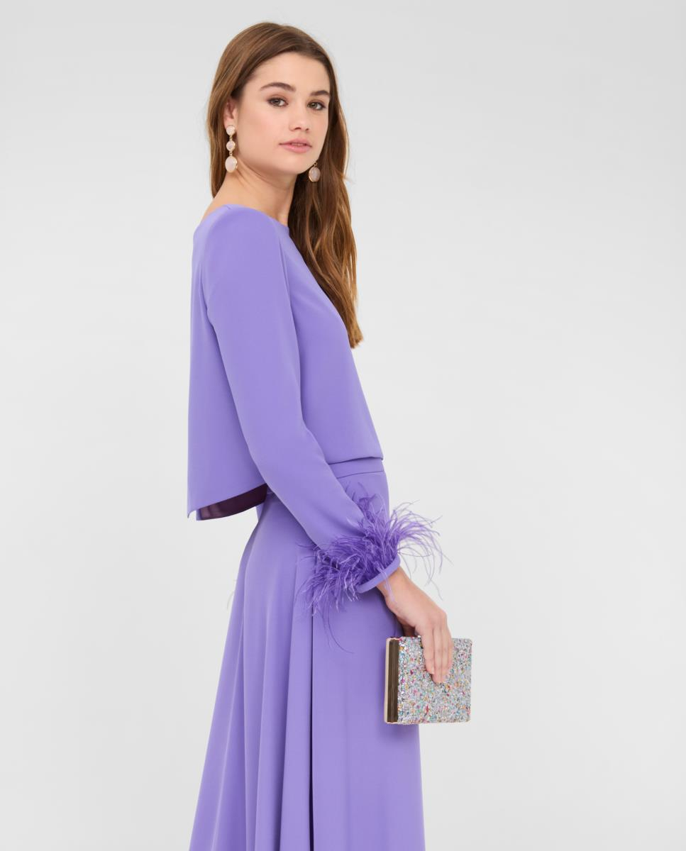 Chaqueta de fiesta confeccionada en crep con detalle en el puño de pluma. Esta chaqueta es reversible y la puedes llevar abierta por delante combinándolo con uno de nuestros tops o abierta por detrás luciendo espalda. Complementos no incluídos.