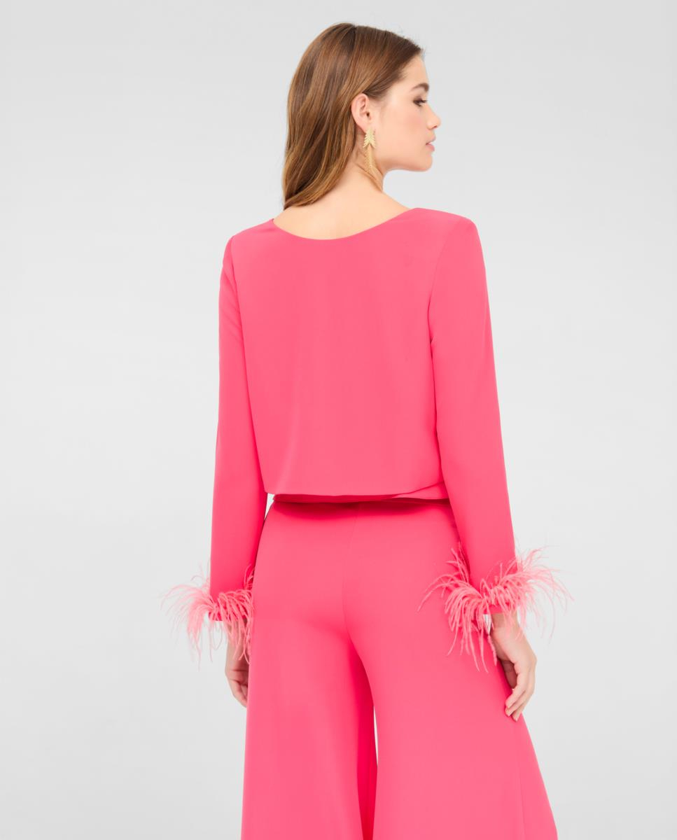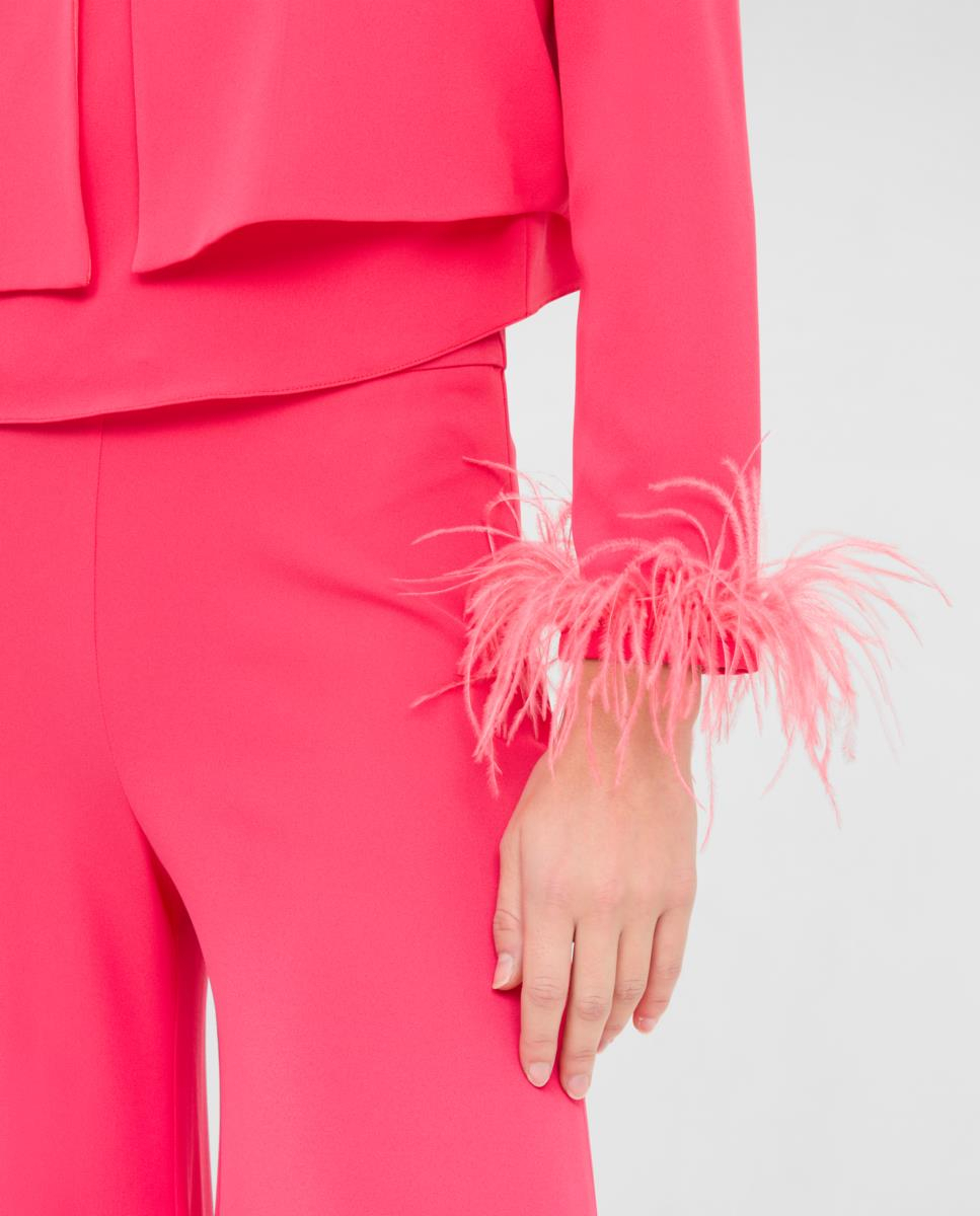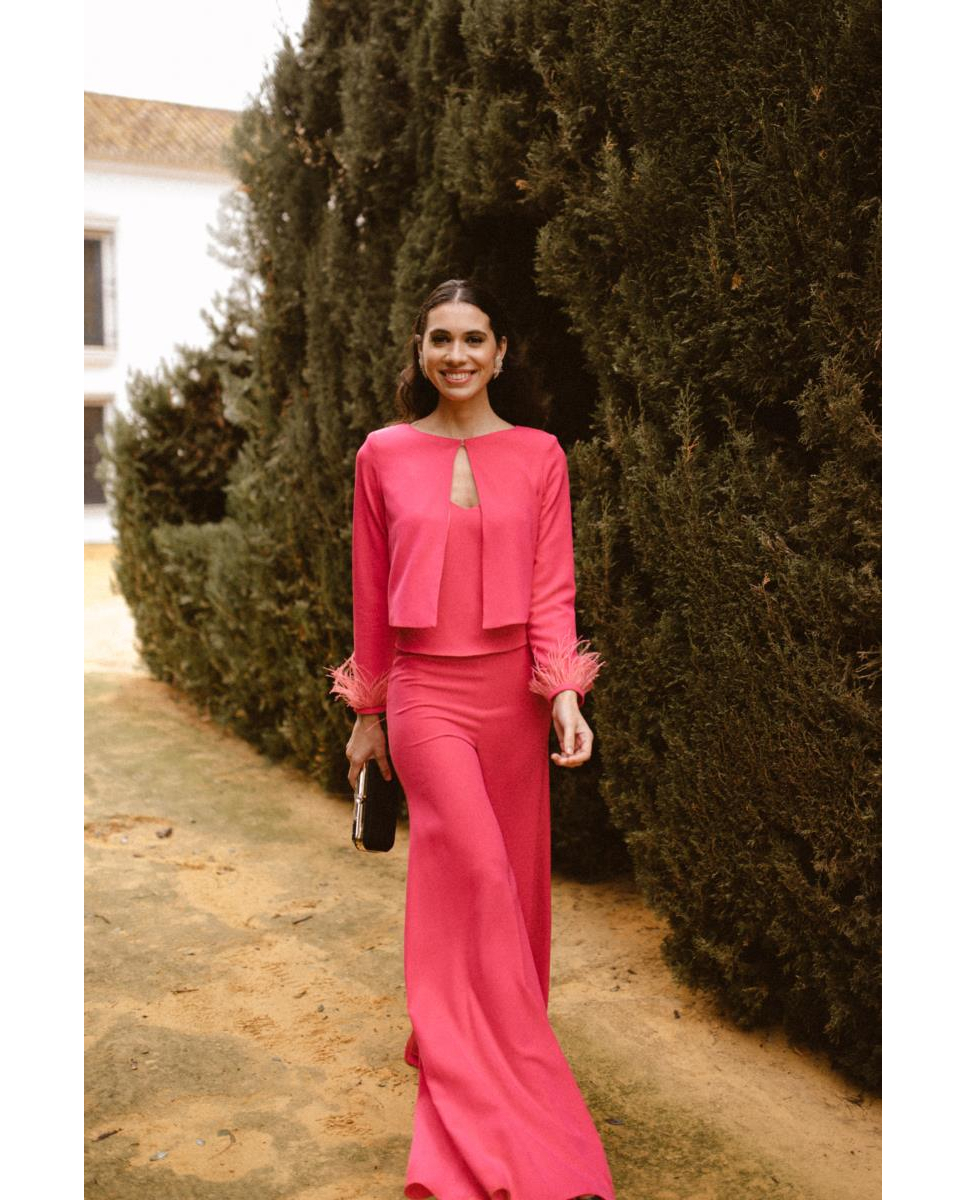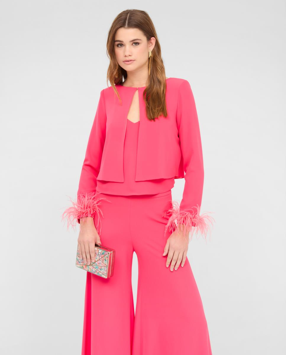 Chaqueta de fiesta confeccionada en crep con detalle en el puño de pluma. Esta chaqueta es reversible y la puedes llevar abierta por delante combinándolo con uno de nuestros tops o abierta por detrás luciendo espalda. Complementos no incluídos.