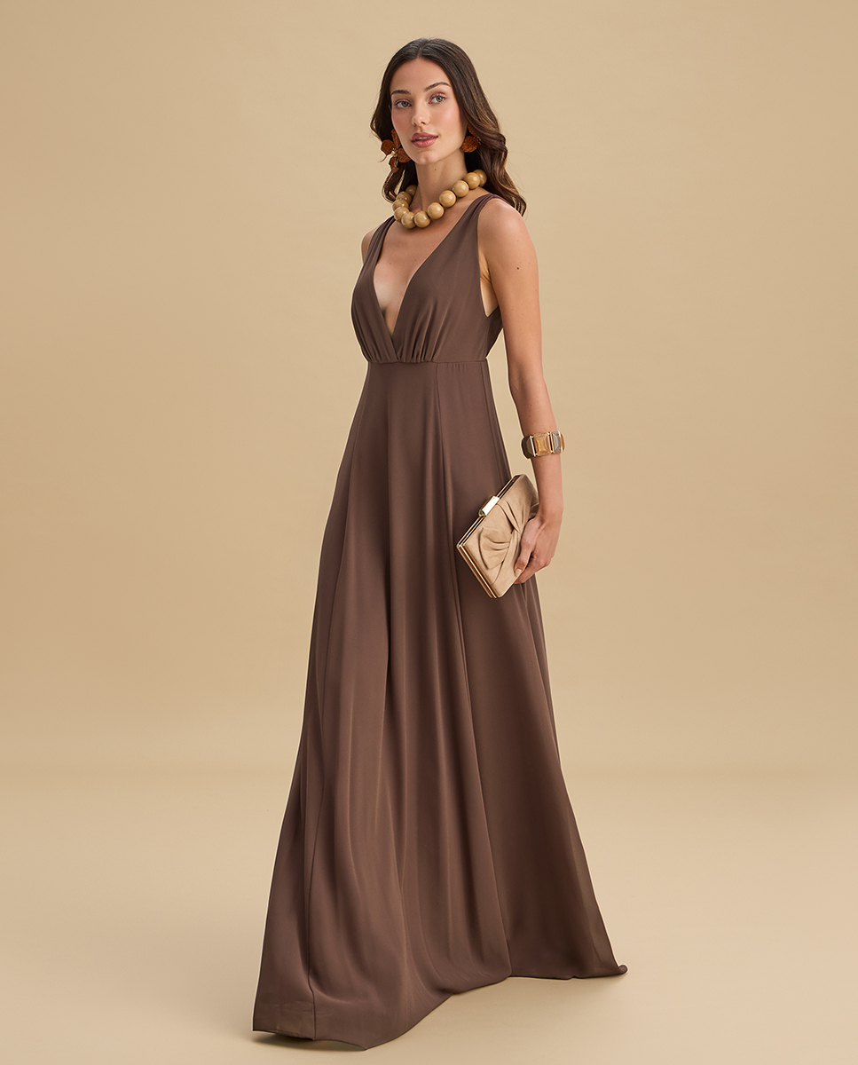 Vestido largo de gasa con escote en V. Falda fluida con vuelo. Complementos no incluidos.