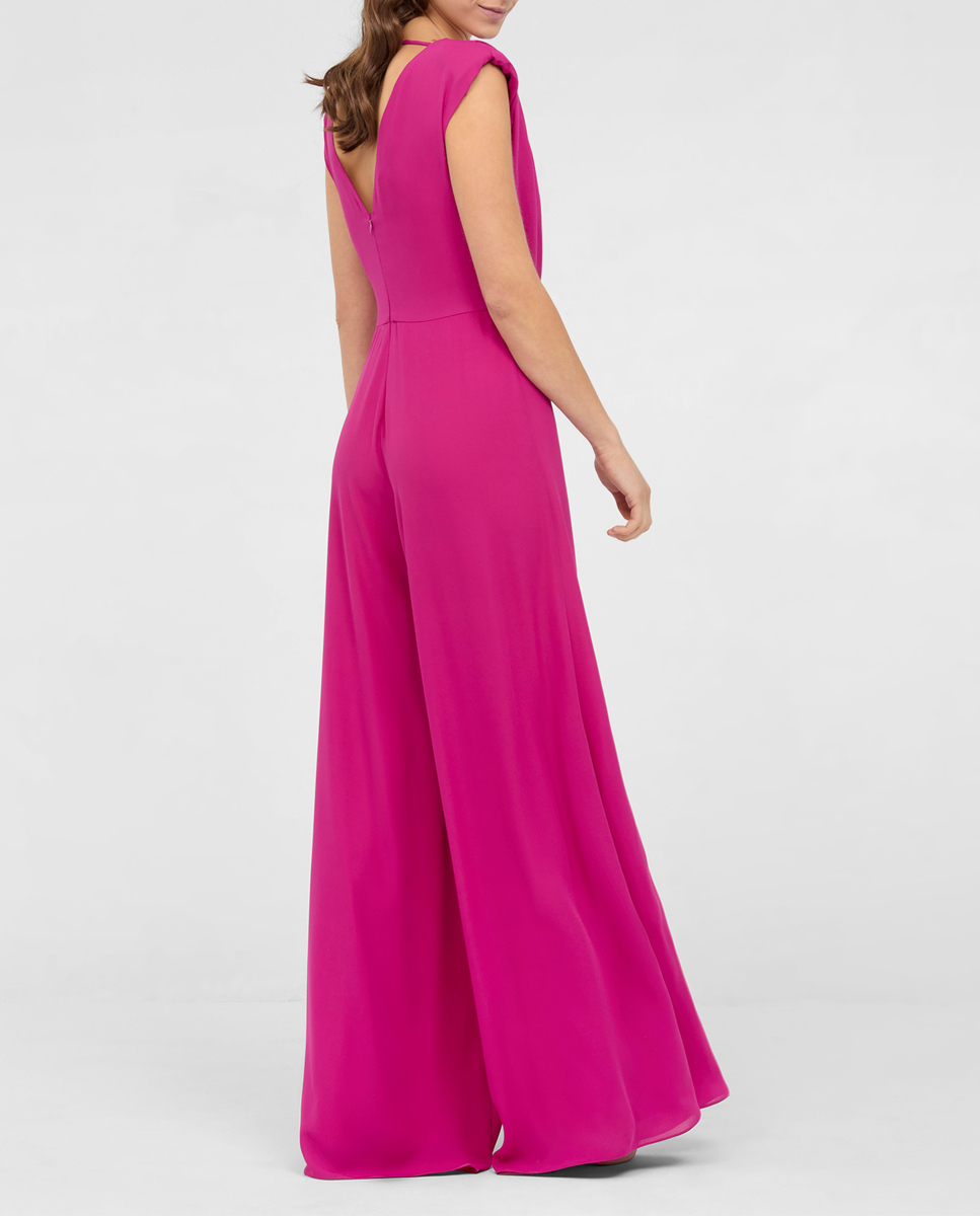 Mono de fiesta confeccionado en gasa crep. Escote en V con drapeado sobrepuesto. Pata ancha fluida. Cierre en la espalda con cremallera invisible. Complementos no incluídos.
