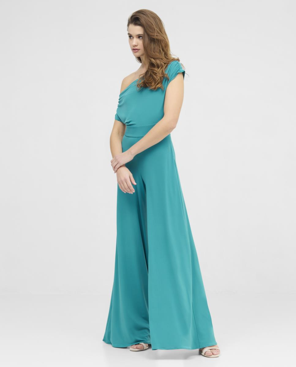 Mono en punto sedoso con escote barco multiposición. Si lo que quieres es resaltar tus hombros este es un tipo de escote ideal. Pantalón tipo palazzo. Complementos no incluídos