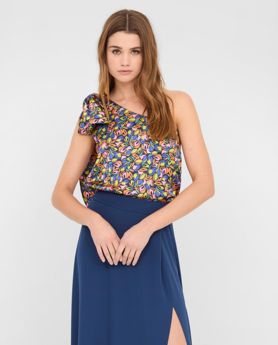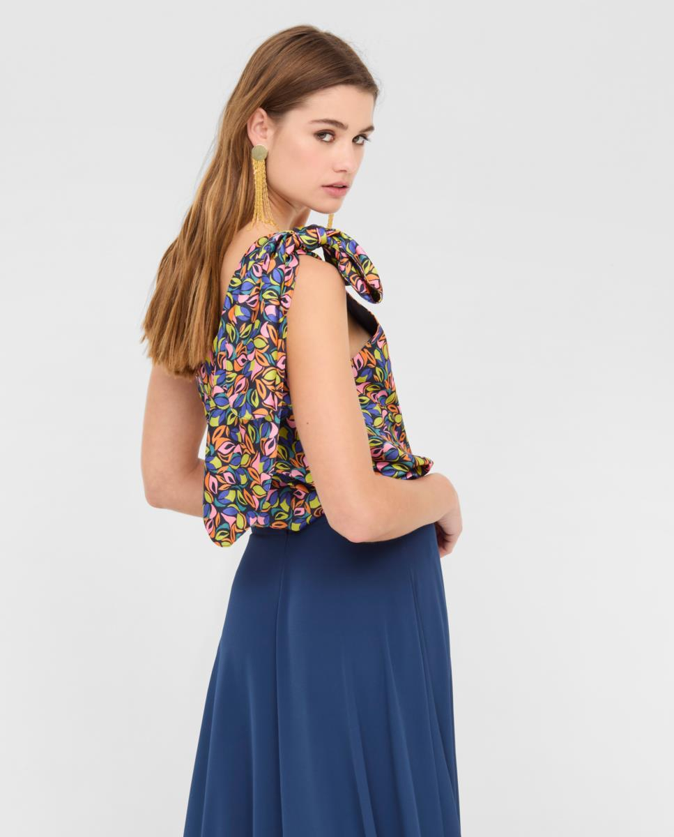 Top de fiesta confeccionado en satén con textura estampado con lazada.Tiene escote asimétrico. El detalle del hombro puede llevarse a modo de lazo, nudo o simplemente suelto tipo capa. Complementos no incluídos