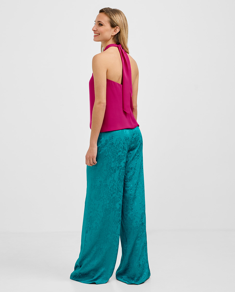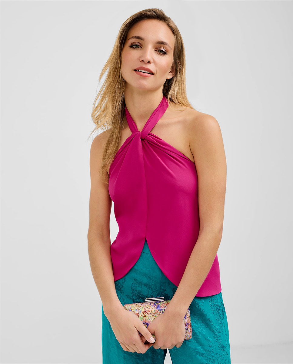 Top made of crepe with a halter neck and closed with a bow. Ideal to combine with our pants and skirts. Accessories not included.