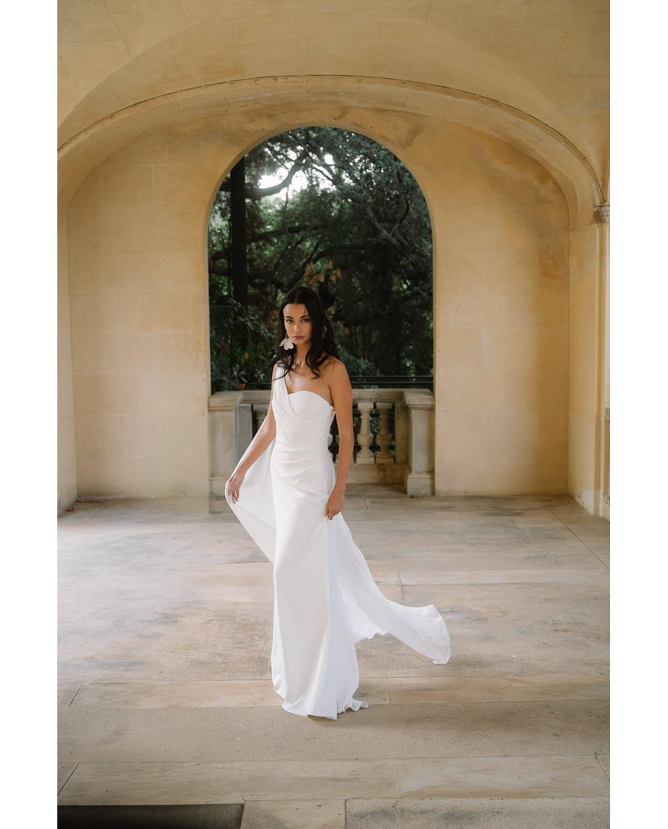 Walk down the aisle to say "I do" in the elegance of this asymmetrical wedding dress with a cape, a piece that combines sophistication, purity, and movement. Its minimalist design and clean lines make it the perfect choice for the modern bride who wants to stand out for her own style without sacrificing delicacy.